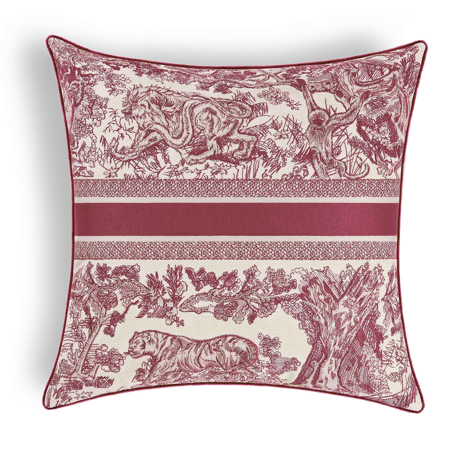 A symbol of Dior's savoir-faire and excellence, Toile de Jouy is constantly reimagined by Maria Grazia Chiuri and adorns new creations in Limoges porcelain. Plates, coffee ware and other stylized pieces are embellished with the burgundy motif. Intense and bewitching, the color also enhances a placemat and napkin set, embroidered pillow, small candle and trinket tray. A celebration of the art of hosting dear to Mr. Dior. Main composition: 100% cotton. Piping: 76% polypropylene, 24% cotton. Filling: 68% polyester, 32% cotton. Made in Italy