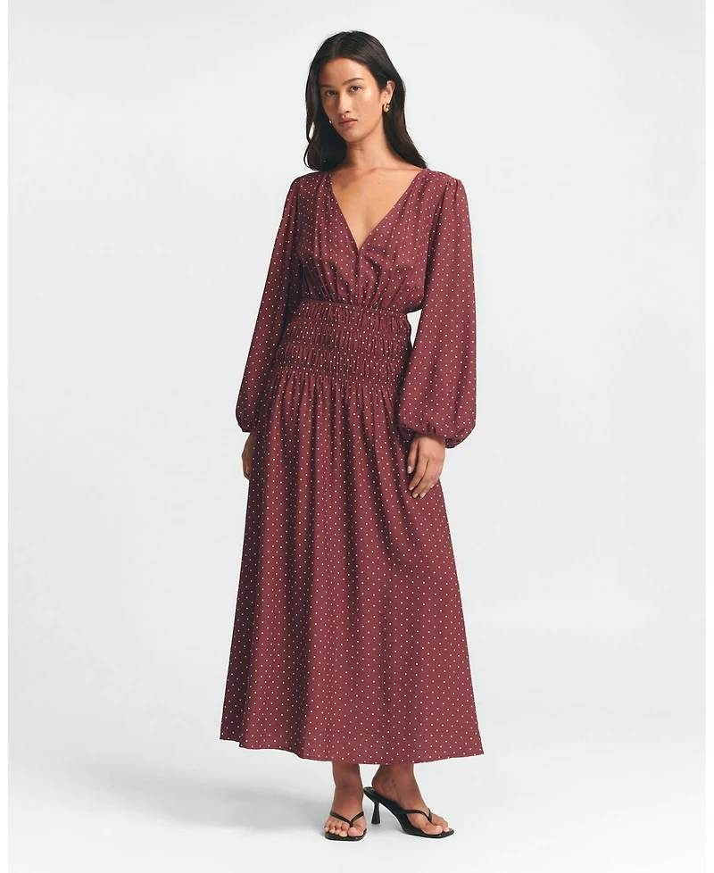The may gather dress by St Mrlo is a chic midi-length woven dress that effortlessly blends sophisticated design with relaxed silhouettes. its delicate black and white polka dot print creates a timeless, versatile aesthetic perfect for transitioning between day and evening looks.