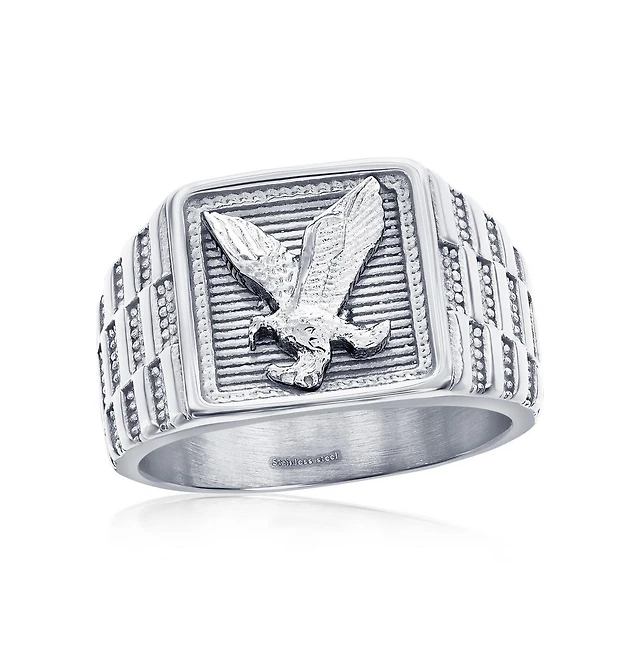 Stainless Steel, Square Textured, Eagle Design Ring