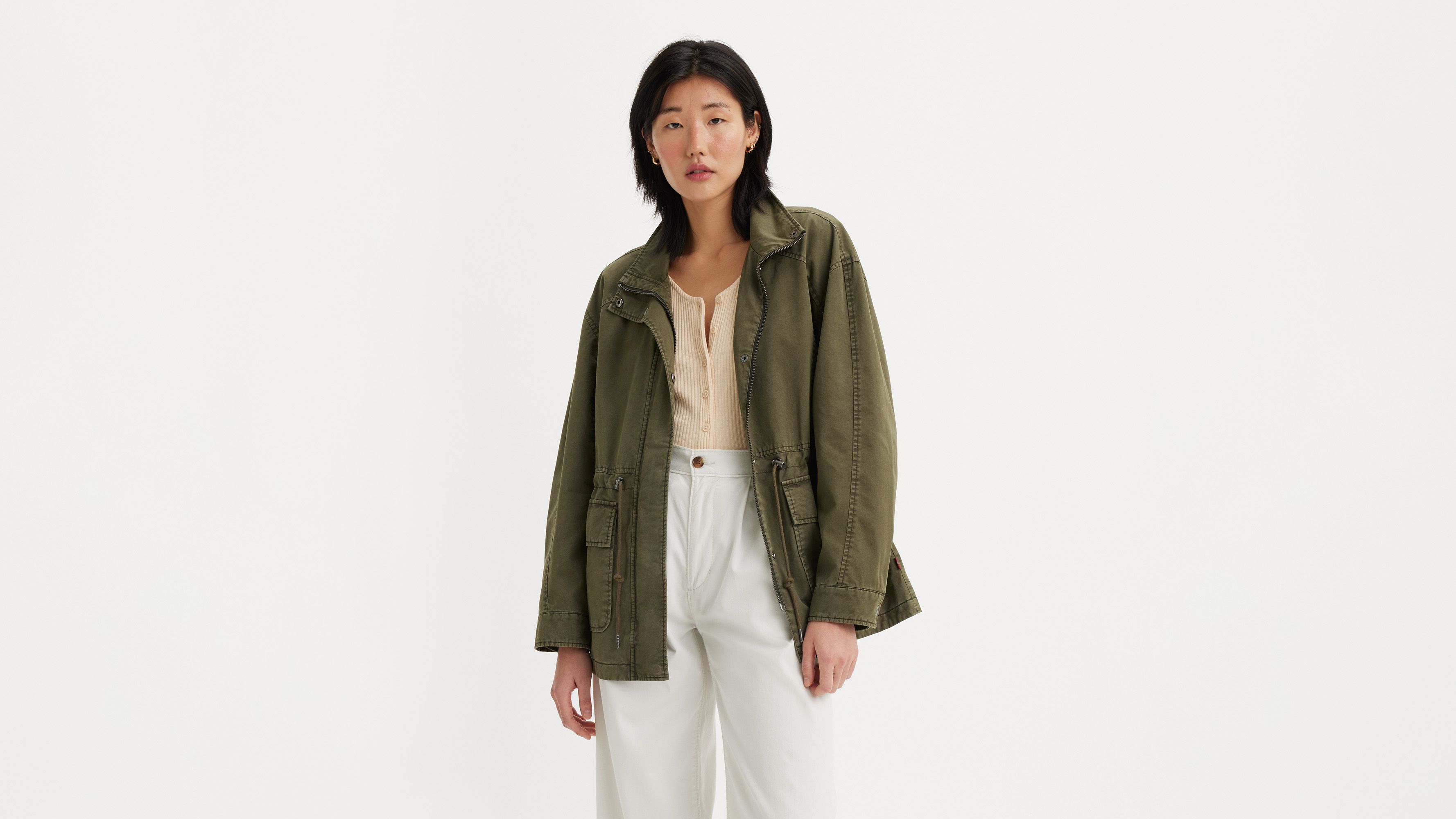 Stand collar cotton utility jacket. Full front zipper closure with snap placket. Stand collar and adjustable draw cord at waist. Two lower snap patch pockets and adjustable snaps at cuff.