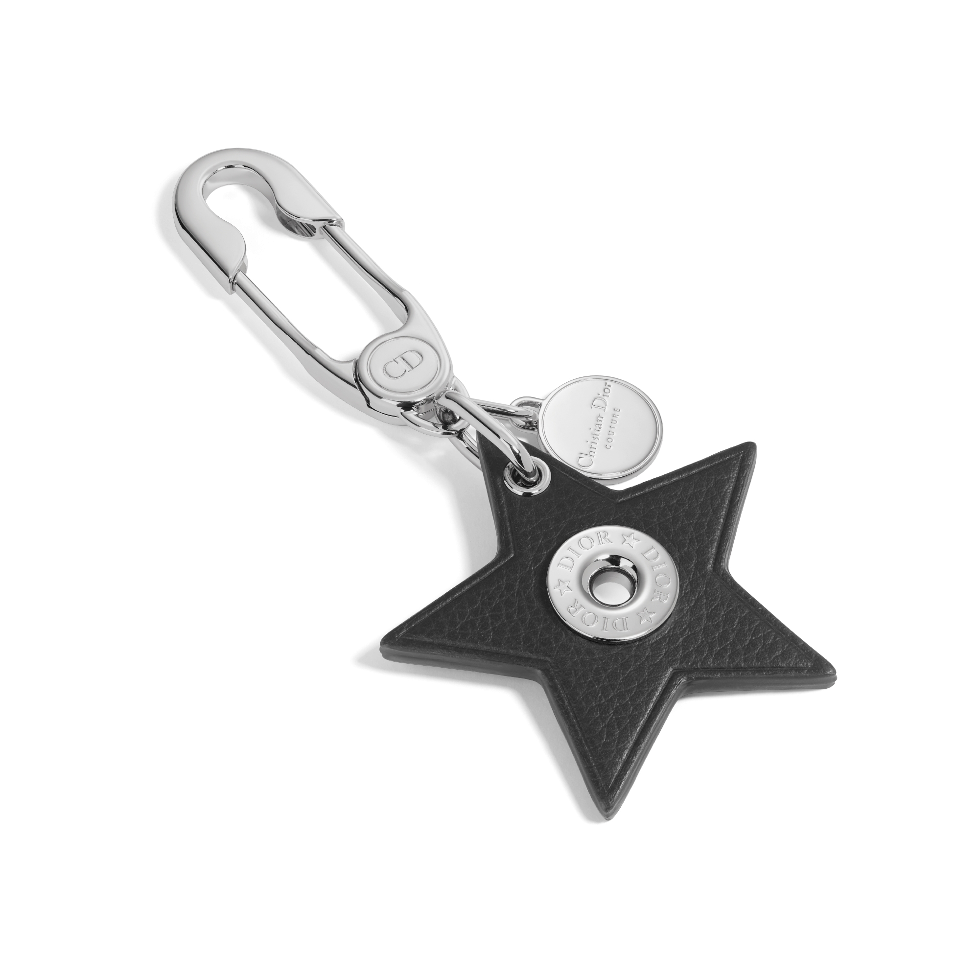 New for Winter 2025, the key ring honors the House's iconic star motif in black grained calfskin and palladium-finish brass. Completed by a Christian Dior Couture medallion, the CD-engraved clasp is inspired by a safety pin, allowing the accessory to be attached to a belt loop or bag. Main composition: brass and calfskin. CD-engraved lobster clasp with safety pin design. Star engraved with Dior in the center. Christian Dior Couture engraved medallion. Dust bag included. Made in Italy or Spain