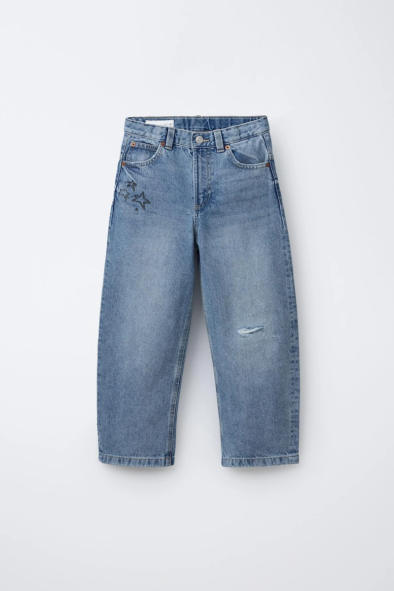 Skater jeans with adjustable interior waistband and front button closure. Front pockets and patch pockets on the back. Star print on the front and back.
