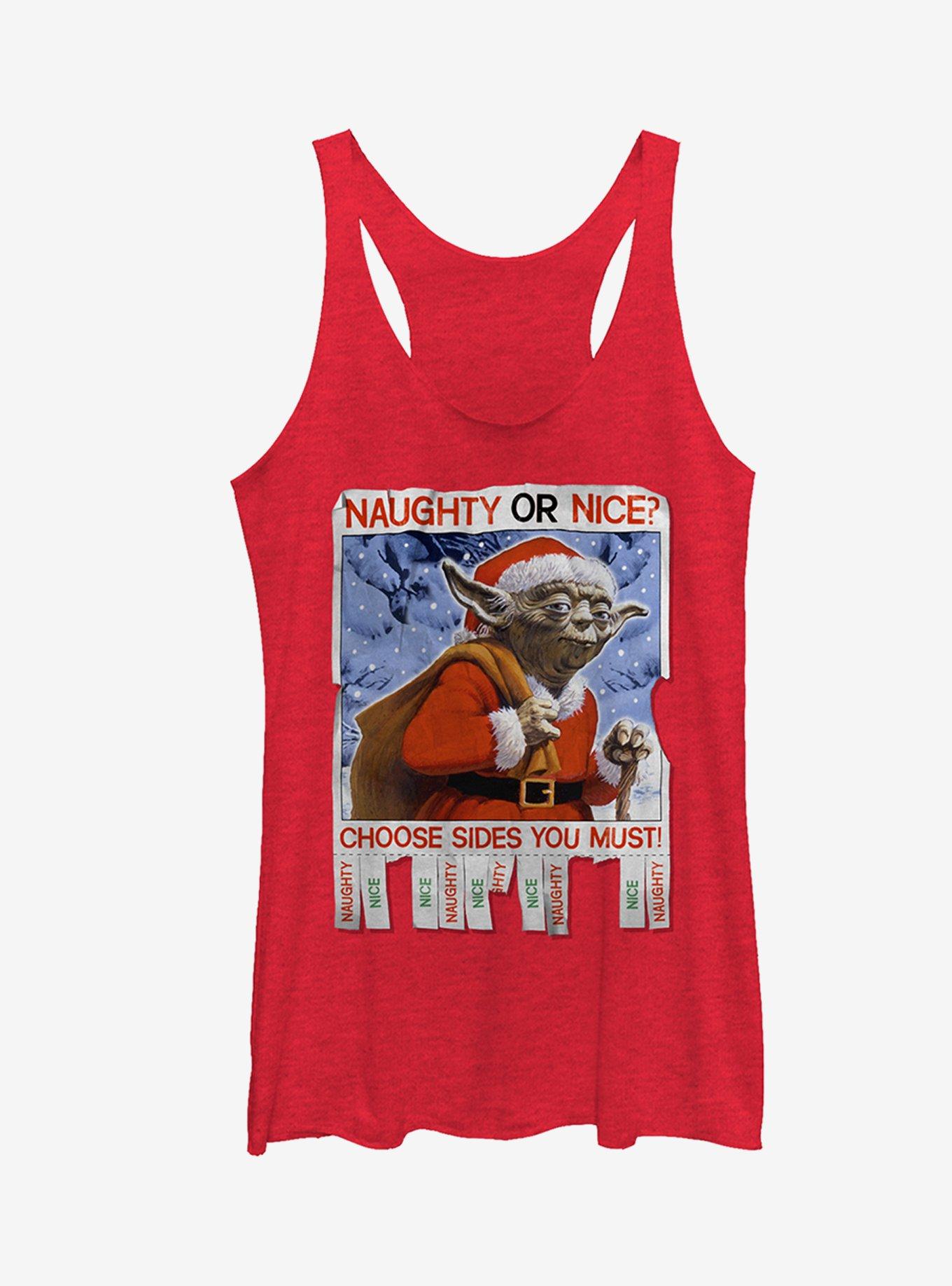 Naughty or nice have you been? Find out with the Star Wars Christmas Yoda Naughty or Nice Women's Racerback Tank Top! Yoda wears a Santa hat and coat across the front of a crumbled poster style front that reads "Naughty or Nice? Choose Sides You Must" in red font on this funny Star Wars Christmas tank.