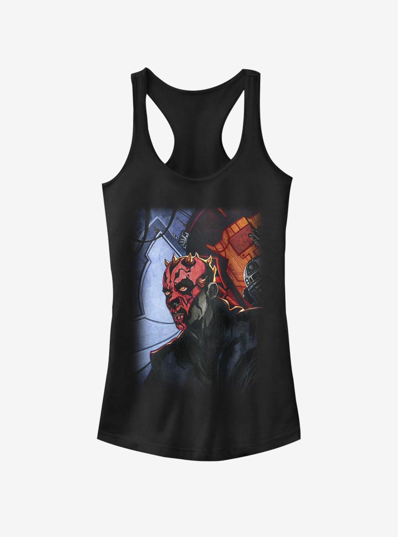 You can't keep a good baddie down. This black racerback Star Wars tank commemorates the return of former Sith Lord -- Darth Maul.