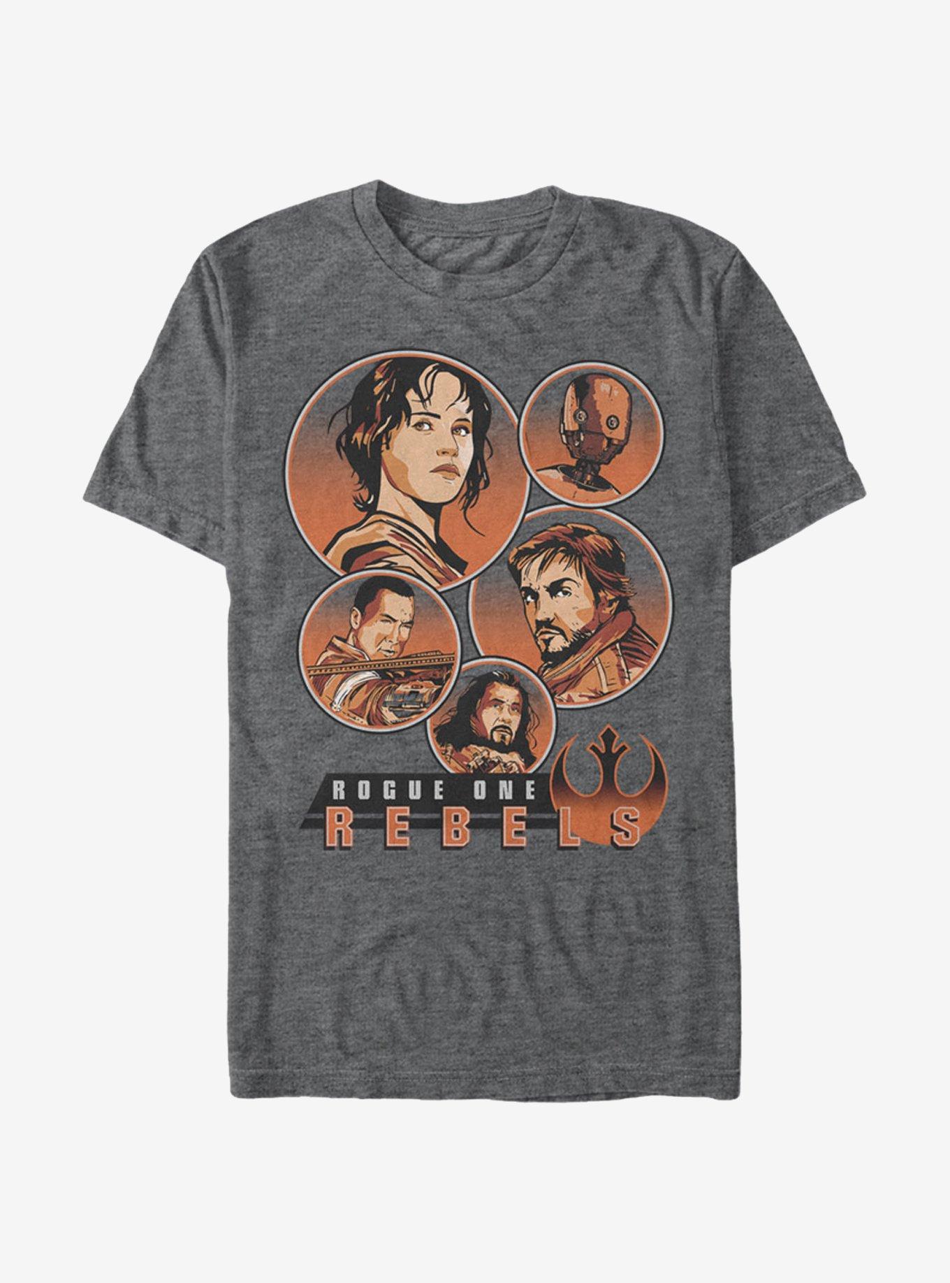 Available for purchase: September 30 Do your part for the rebellion and wear the Star Wars Rogue One Rebellion Hero Circles Heather Gray T-Shirt! Jyn, Chirrut, Cassian, K-2SO, and Baze are portrayed in a comic book style print with "Rogue One Rebels" below them on this cool gray rebel tee. 60% Cotton, 40% Polyester.