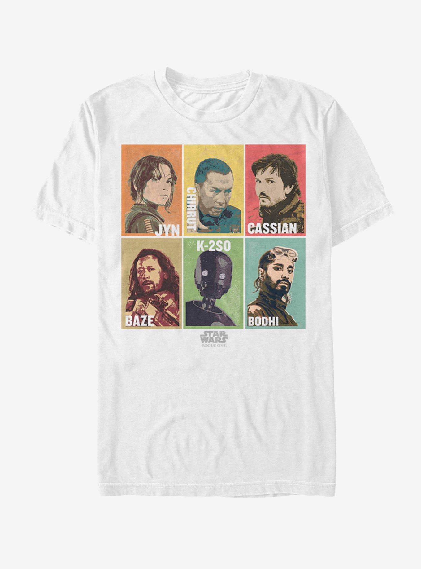If you have to go up against the Imperial army, at least do it while wearing the Star Wars Rogue One Rebellion Panels White T-Shirt! Channel the strength of Jyn, Chirrut, Cassian, Bodhi, K-2SO, and Baze with this awesome white Rogue One shirt that portrays each rebel across the front. 100% Cotton.