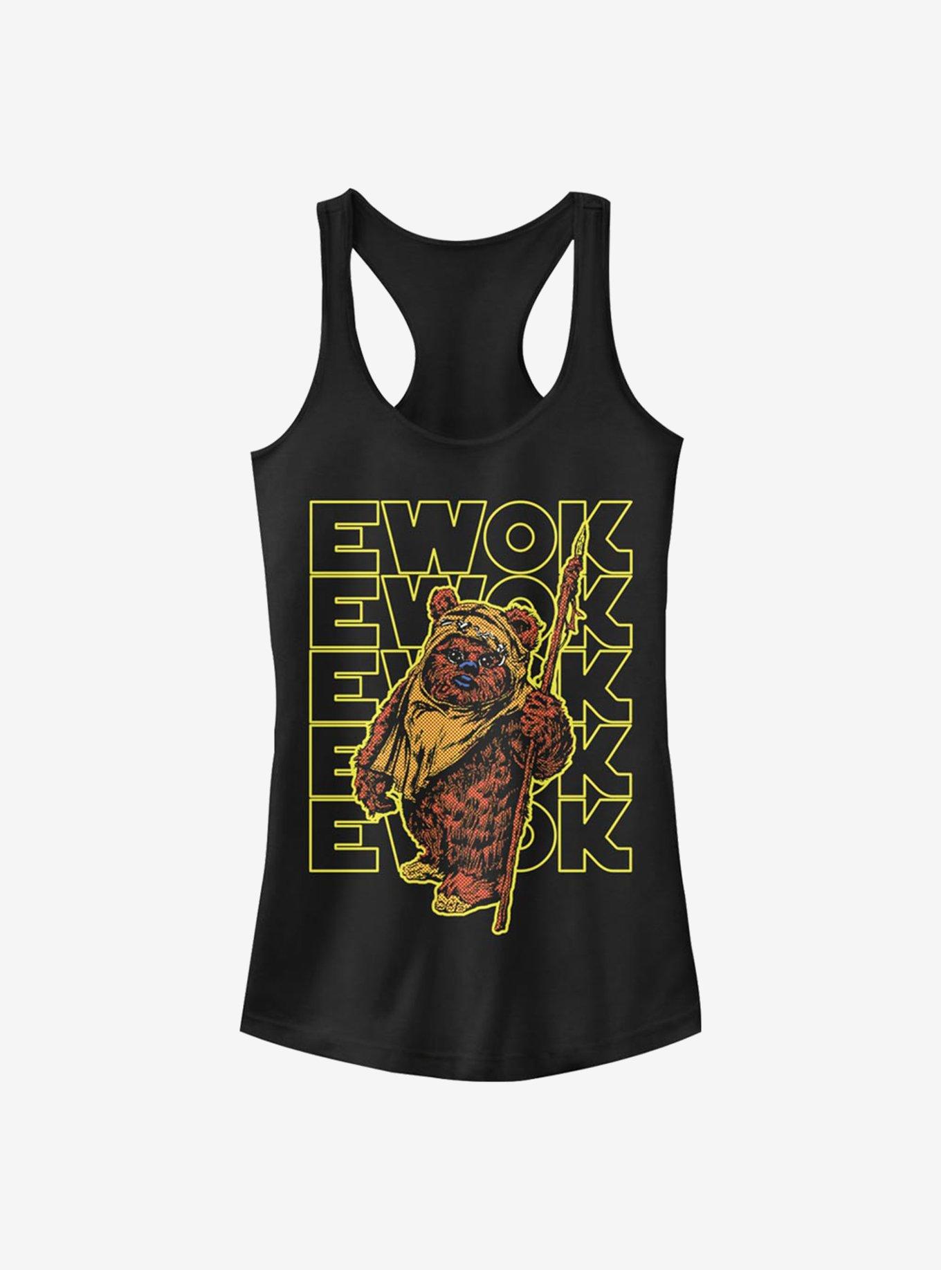 Welcome to the forest moon of Endor! This black Star Wars tank features one of its inhabitants -- Wicket W. Warrick -- with a repeated Ewok logo behind him.