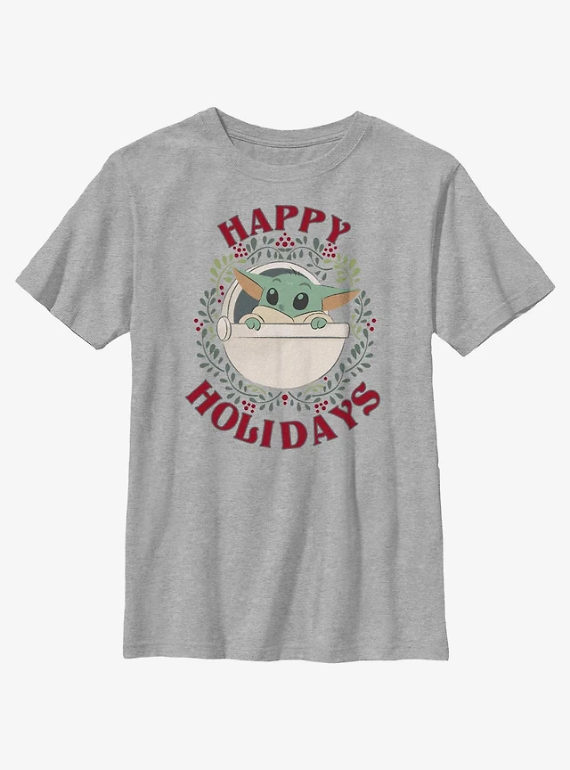 Star Wars The Mandalorian Grogu Wreath Happy Holidays Youth T-Shirt