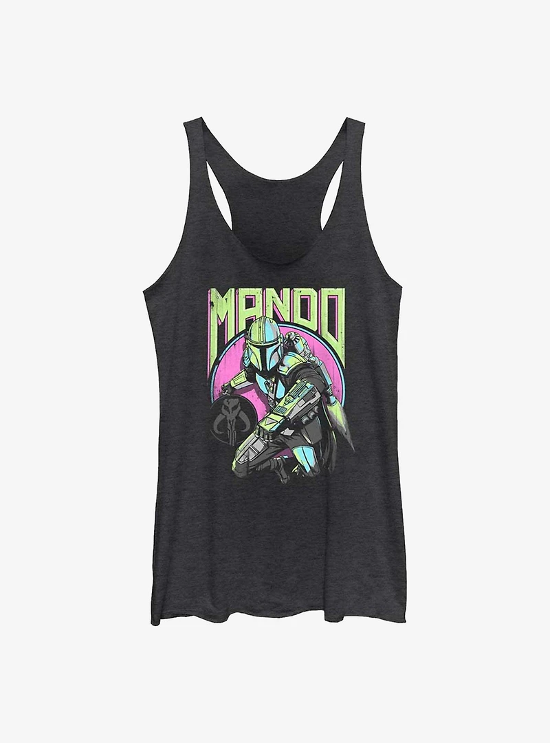 The perfect Mando meets eighties mashup! Din Djarin and a Mythosaur skull appear before a pink and green color scheme on this racerback tank -- inspired by the Disney+ series, Star Wars: The Mandalorian .