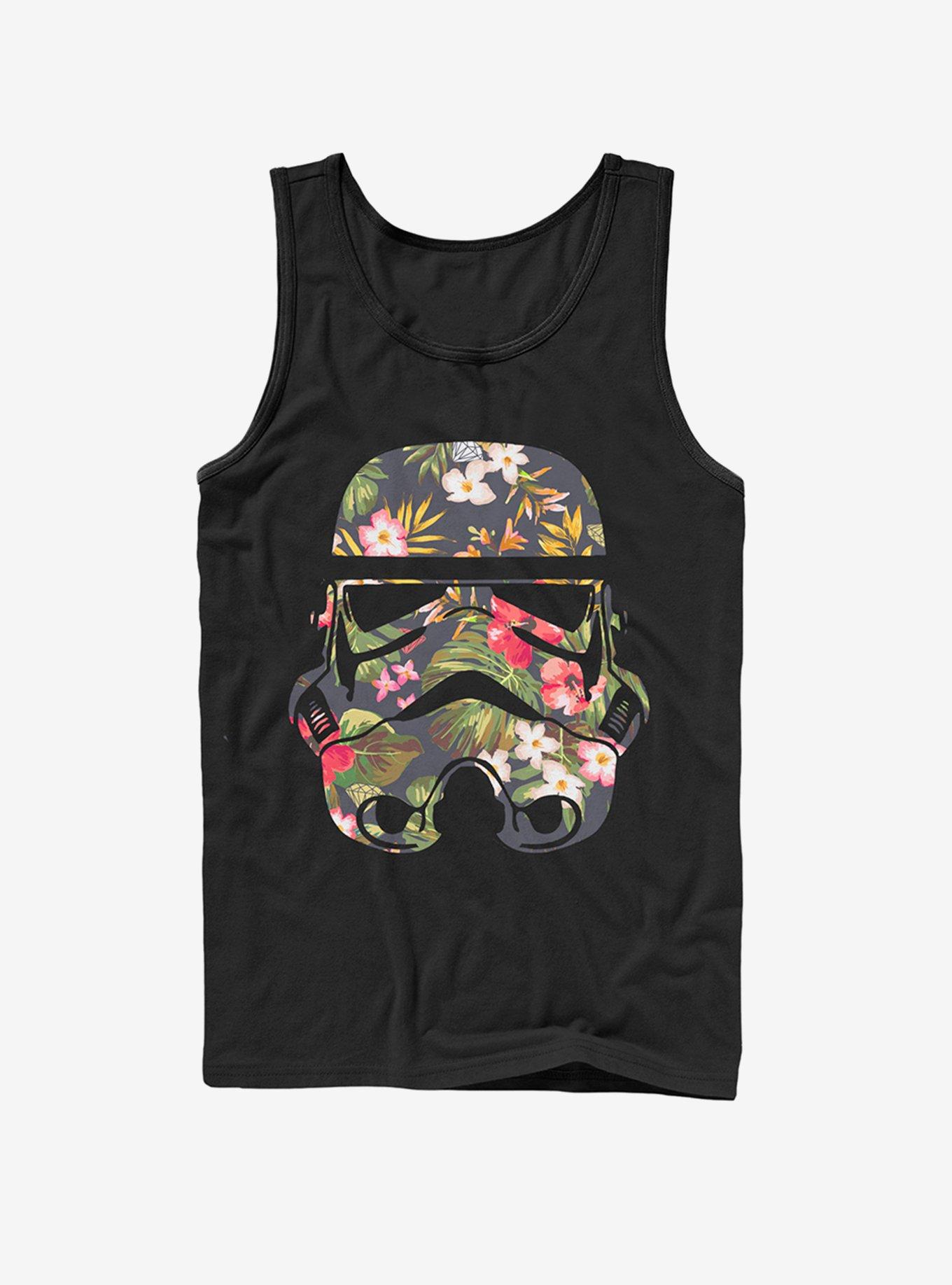 Even those on the Dark Side can stop and smell the hibiscus with this black Star Wars tank. This unique Star Wars style features a Stormtrooper helmet in a colorful tropical floral print -- so fans can celebrate the sunny side of the soldiers of the Galactic Empire.