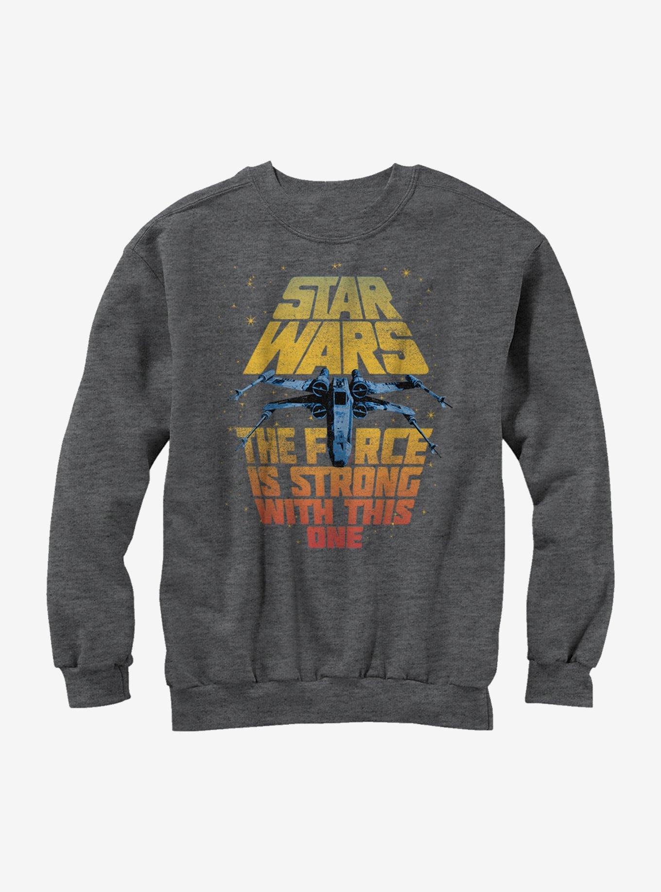 Red Leader is standing by with the Star Wars X-Wing Force is Strong With This One Heather Charcoal Sweatshirt! An X-wing fighter soars between the Star Wars logo and "The Force is Strong With This One" printed in a distressed style on the front of this awesome gray Star Wars sweatshirt. 50% Cotton, 50% Polyester.