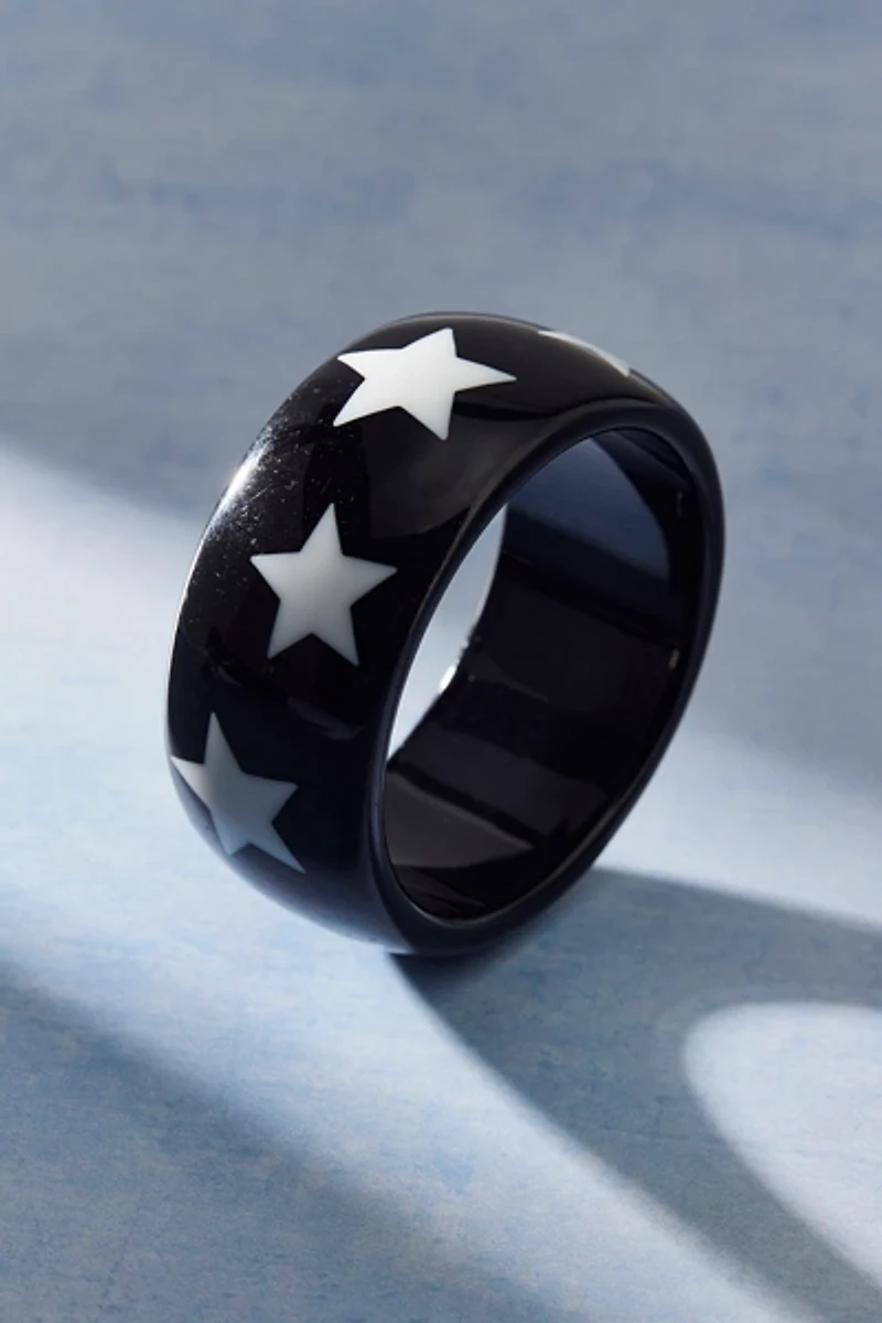 In bold black and white, this wide bangle bracelet is topped with a star pattern for a punk edge. Crafted from lightweight resin for a chunky-yet-light silhouette.
