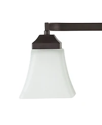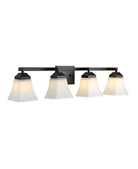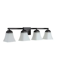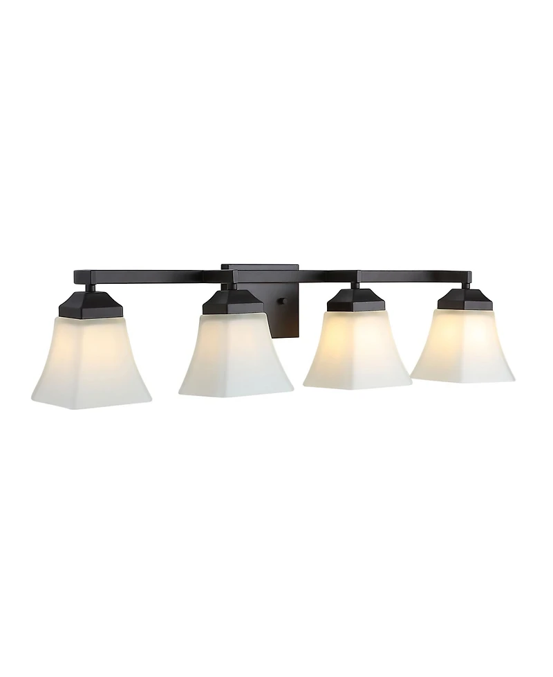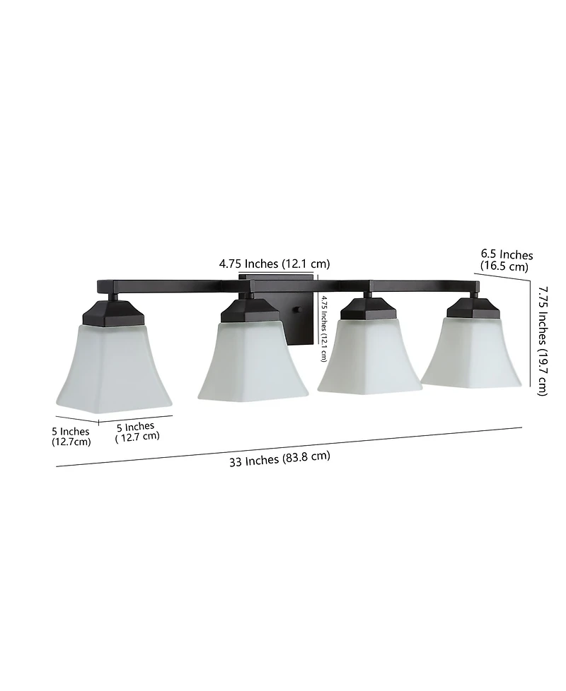 The squared lines of this 4-light vanity fixture give it a pared-down traditional look. A soft black finish and flared shades add low-key vintage-like style over a bathroom mirror. Frosted glass provides soft, diffused light from the bright Led bulbs.