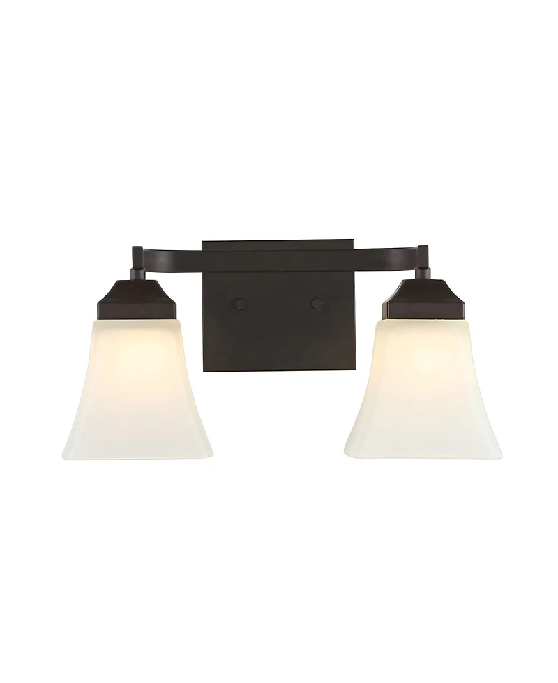 The squared lines of this 2-light vanity fixture give it a pared-down traditional look. A soft black finish and flared shades add low-key vintage-like style over a bathroom mirror. Frosted glass provides soft, diffused light from the bright Led bulbs.