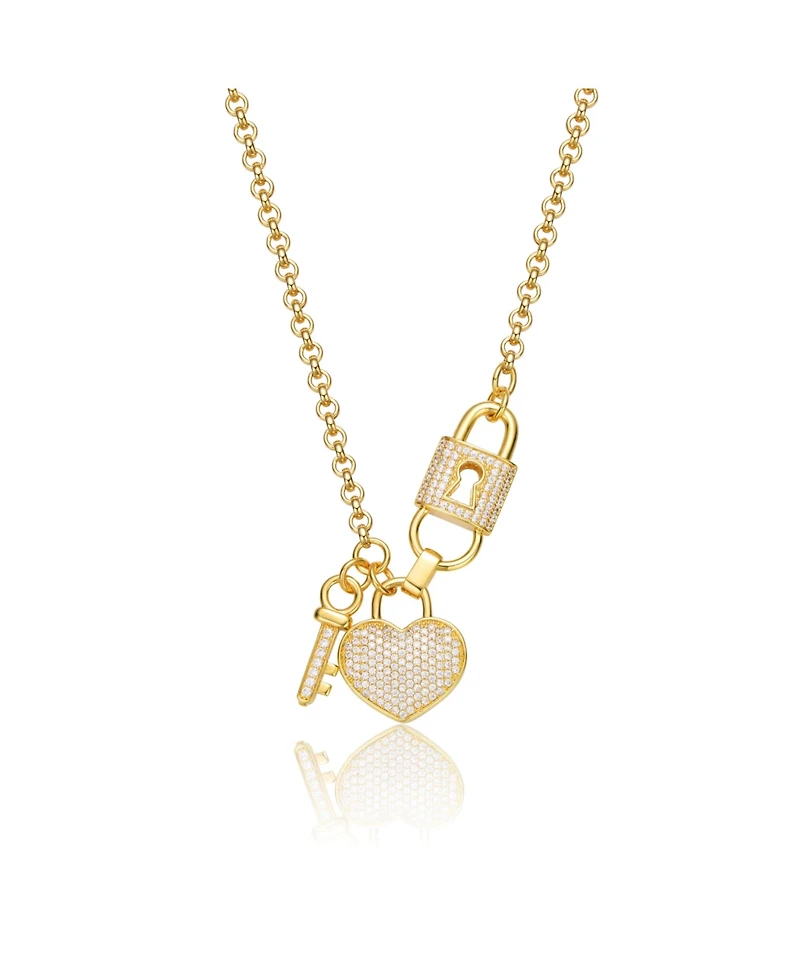 Sterling Silver 14K Gold Plated with Clear Cubic Zirconia Heart & Padlock Charm Necklace
