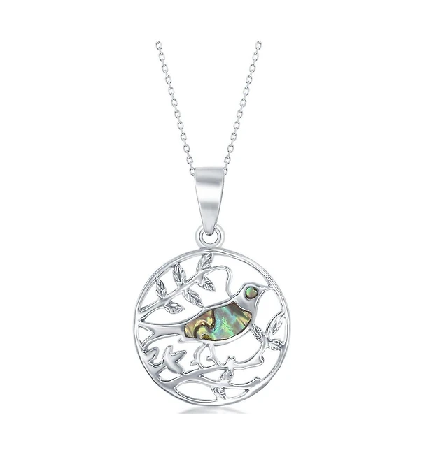Sterling Silver Abalone Bird On a Branch Pendant Necklace