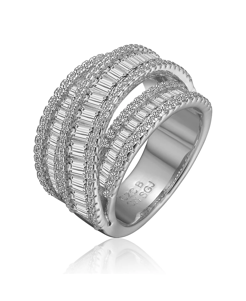 Elevate your jewelry collection with this breathtaking crossover ring, a true masterpiece of light and luxury. Meticulously crafted in fine sterling silver and available in your choice of shimmering White Gold Plating or opulent 14K Gold Plating, this ring features a sophisticated multi-row design that wraps the finger in pure brilliance. A captivating harmony of baguette-cut and round brilliant-cut cubic zirconia stones are expertly secured in channel and pave settings, creating a multidimensional sparkle. Whether you are commemorating a milestone or adding a touch of aspirational glamour to your daily ensemble, its timeless elegance and smooth, high-polish interior ensure a comfortable fit for frequent wear. This is more than just an accessory it is a statement of refined taste and enduring style.• Premium Finishes: 14K and White Gold Plated• Intricate Crossover Multi-row Silhouette• Exquisite Top Grade Baguette and Round Cz• Genevive Accessible Opulence