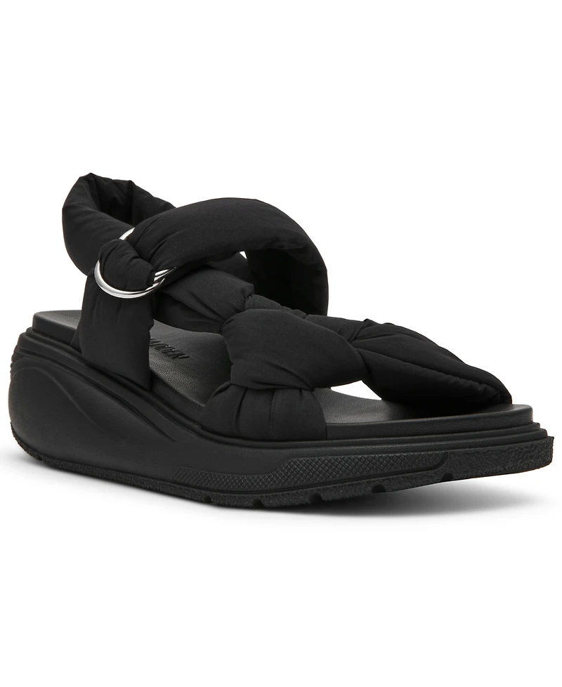 Off-duty attitude defines these Steve Madden Giles sport sandals, styled with a round toe for relaxed comfort and a clean, modern profile. A secure slingback strap keeps every step steady, while the elevated flatform soles deliver bold height with cushioned support for day-long wear.