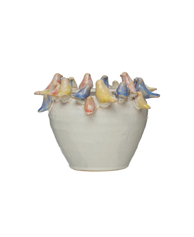 Stoneware Planter with Birds On Rim, Reactive Glaze