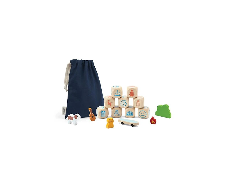 The PlanToys Storytelling Dice is a fun and stimulating game for the whole family. Players take turns rolling the dice and are instructed to act out narratives that correspond to the images on each. This game strengthens multi-tasking and concentration skills by encouraging players to recall memories from the past. It also sharpens communication skills through the joys of storytelling. Combine the dice with blocks that depict images of objects and nature to enhance the story. Storytelling Dice includes 9 action tiles, 6 story add-on blocks, and a cloth bag for storage.