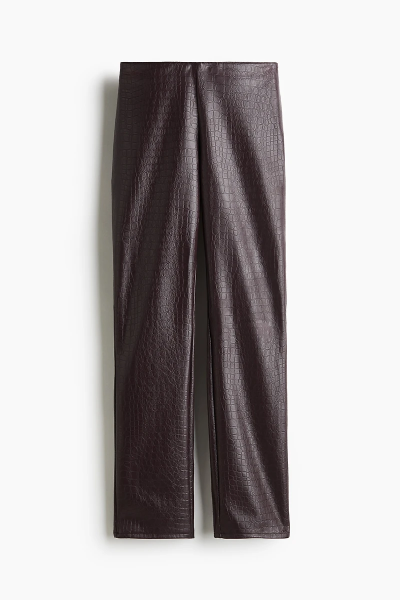 Pants in coated fabric. Visible zipper at one side with concealed button. Straight legs.