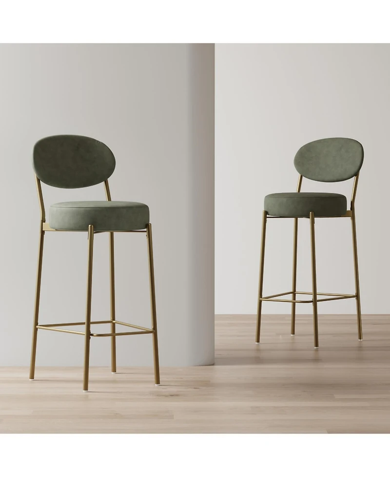 Glamorous bar stools (set of 2). Gold frame, green faux leather seat. Modern style, footrest, and floor protectors. Perfect for kitchen, bar, or dining!