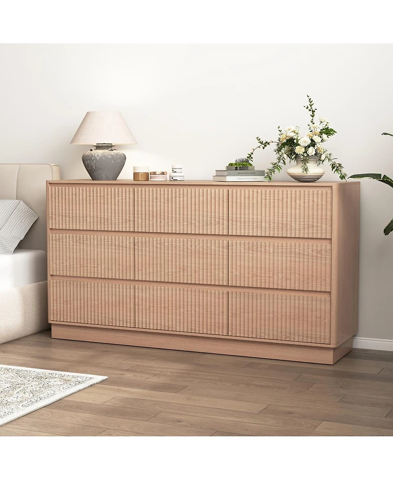 Mid-century modern 9-drawer dresser with unique wave design. Ample, scratch-free storage and versatile use. Easy assembly.