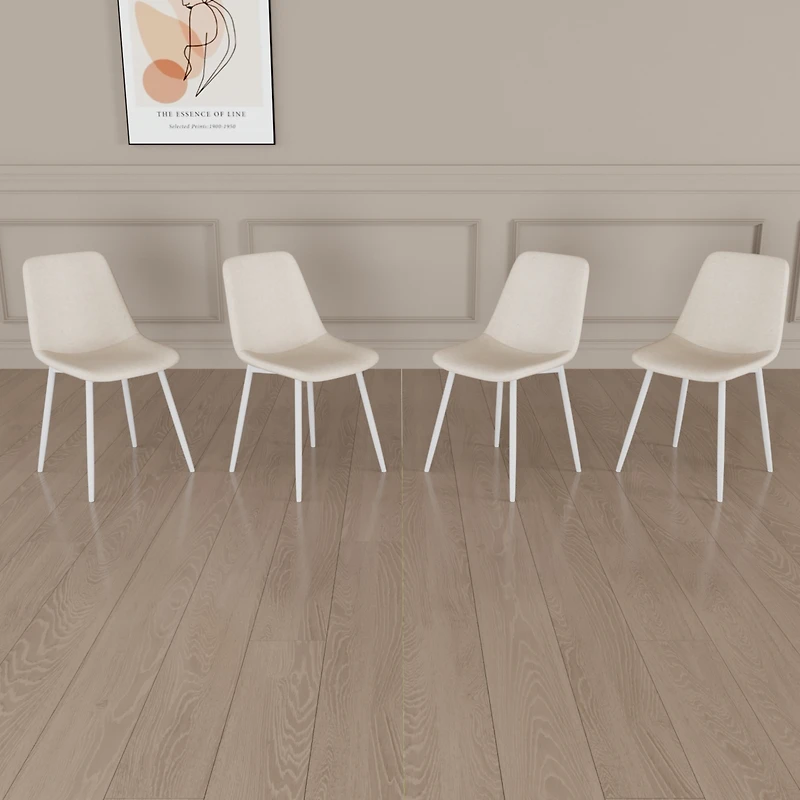 Modern dining chairs with linen padding and sturdy white metal legs. Set of 4, perfect for any dining room. Durable and stylish, with a comfortable backrest and seat cushions.