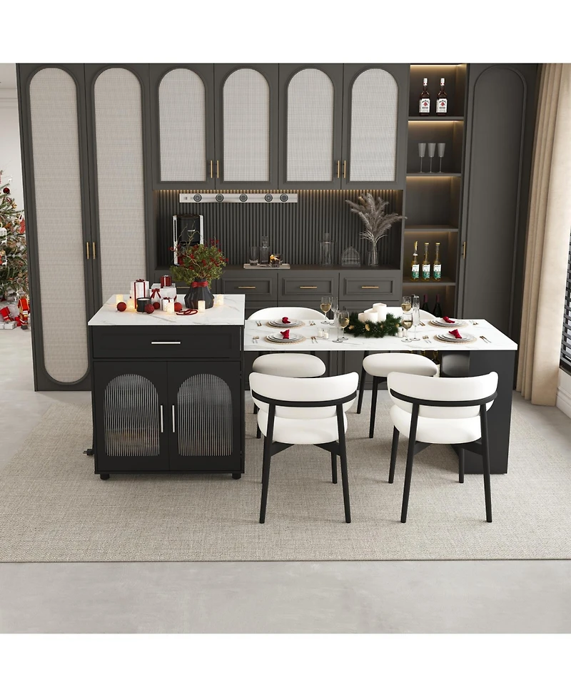 Retractable kitchen island: Expands to 80" table, charging station, ample storage, marble-grain top, easy assembly. Maximize space and function!