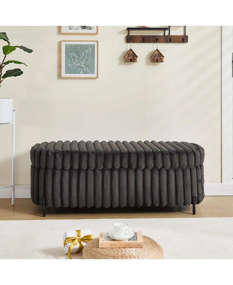 Faux fur storage bench with flip-top. Solid wood frame, metal legs. Perfect for entryways or bedrooms. Easy 5-min assembly. 275 lb capacity.