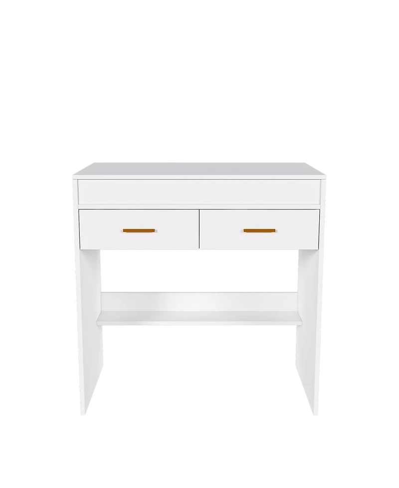 This vanity boasts a space-saving flip-top design, transforming from a makeup station to a sleek desk. Its Led mirror offers customizable lighting, while a built-in power outlet and smart storage keep essentials organized. Perfect for small spaces, it's a versatile, stool-free solution.