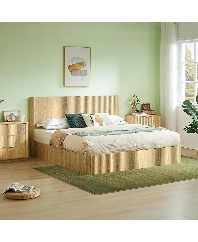 King-size walnut bed frame with gas lift storage. Rustic modern design with 12 slats. Easy, tool-free assembly in under 2 hours. 1000 lb capacity.