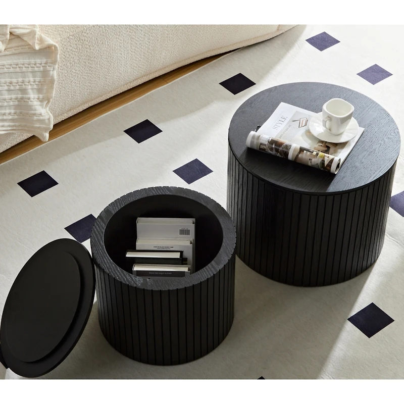 Our premium black nested table set includes a durable and stylish round coffee table with a hidden storage function, perfect for saving space in any living room or lounge area.