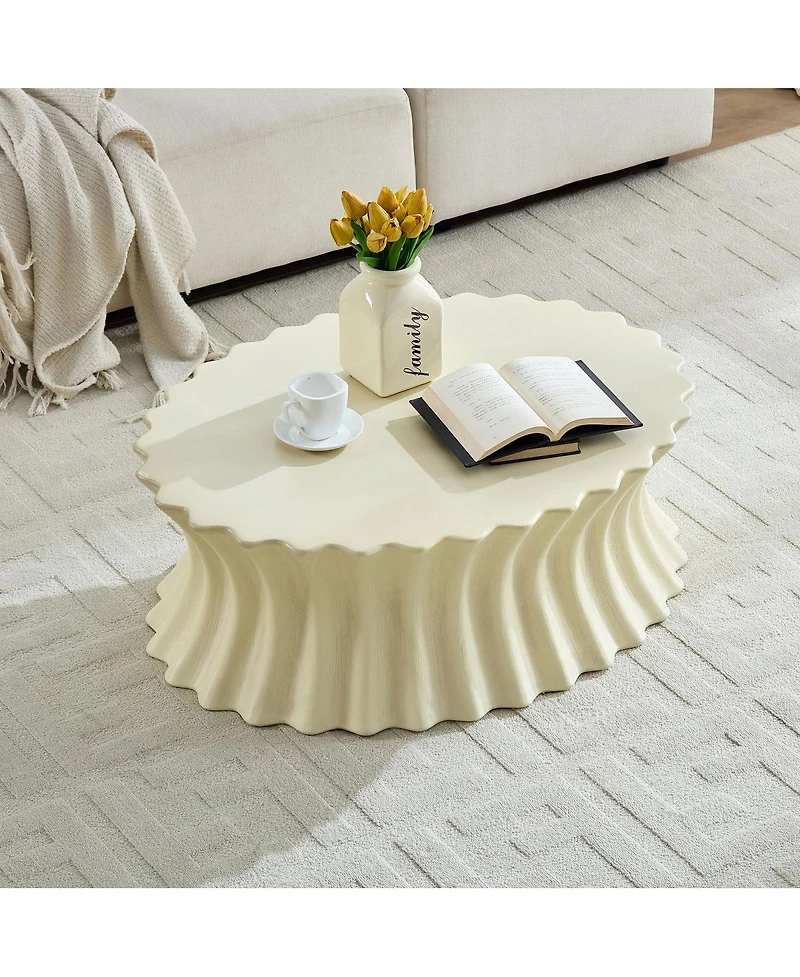 Elevate your living room with this 35.04" oval fiberglass coffee table. Its vintage, distressed finish and beige color complement any decor. No Assembly Required. Perfect for drinks and books.