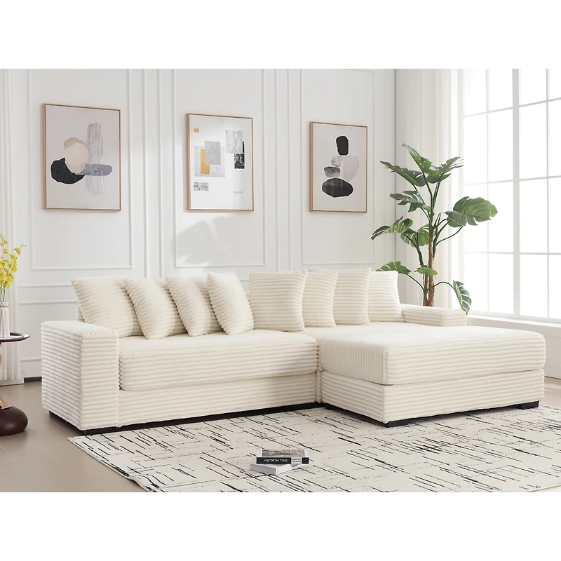 This versatile sectional sofa features luxurious corduroy fabric, providing tactile pleasure and durability. Its generous armrests and right-side chaise offer ample space for relaxation. Eight soft throw pillows add personalization and comfort, while black plastic legs provide stable support. With its modular design, this sectional is perfect for enhancing any living space.