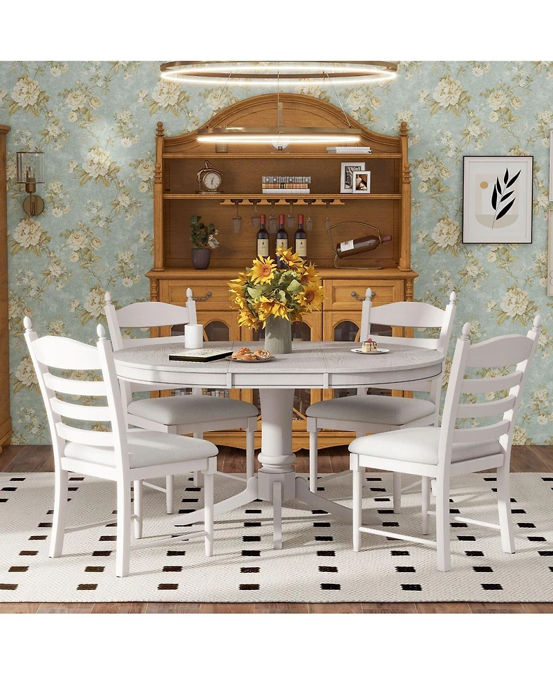 This retro dining set features a unique pedestal base and ladder back chairs for timeless elegance. Crafted from solid rubberwood, it offers durability and comfort. The extendable tabletop adjusts from 42" to 58", perfect for families.