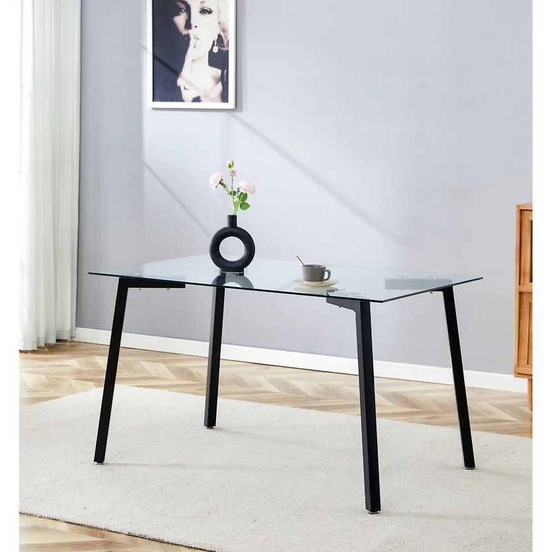 Contemporary glass dining table for 4 with a sleek design. Made from durable tempered glass and metal legs with a wooden finish. Easy to assemble and move, perfect for small families and various settings.
