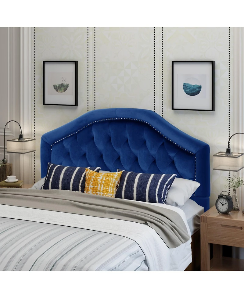 Indulge in blissful slumber with our contemporary headboard. Camelback silhouette meets smooth upholstery, creating a captivating masterpiece. Adjustable legs ensure effortless compatibility with various bed frames. Button-tufted diamond stitching exudes sophistication, while nailhead accents add a touch of opulence.