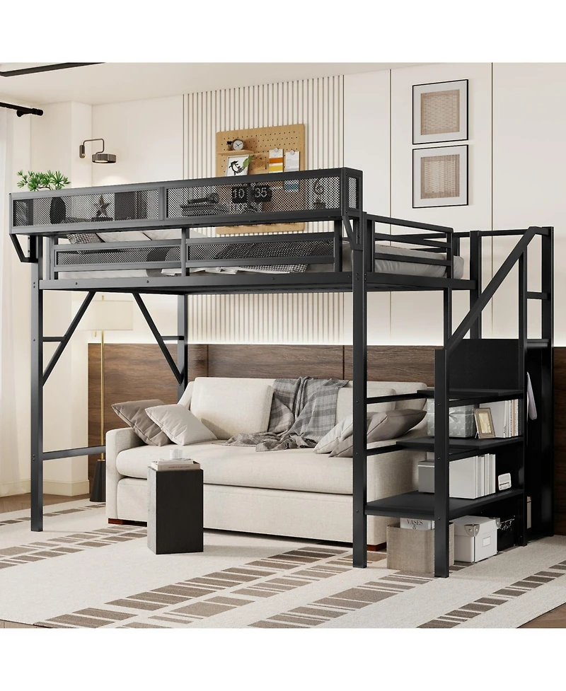 Maximize space with this Twin Xl loft bed! Features stairs, wardrobe, and storage shelves. Durable metal construction in black. Perfect for small rooms. 99.4