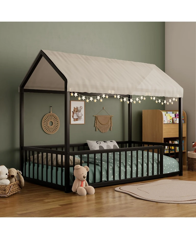 Streamdale Furniture Twin Montessori Metal Floor Bed Frame, House with Fence, Easy Assemble, Black