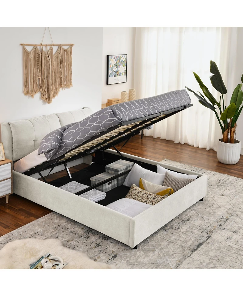 Queen chenille bed frame with storage drawer. Sturdy metal and wood slat support. No box spring needed. Easy assembly. 500lb capacity.
