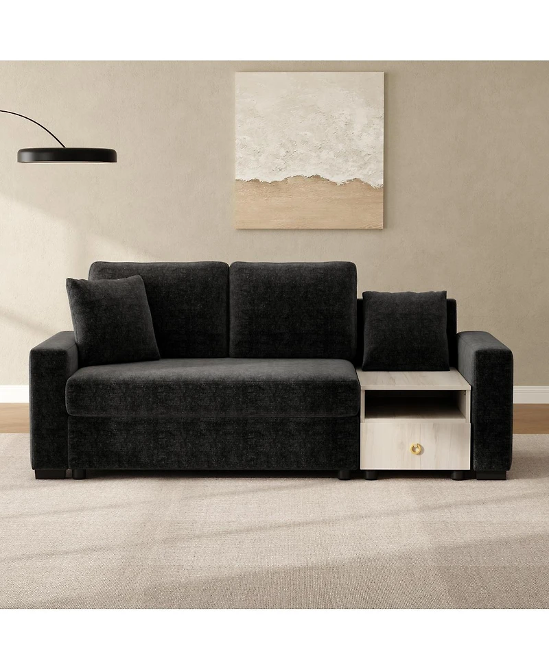 Experience ultimate comfort and organization with this chenille sofa. Features storage armrest, plush pillows, and a console with drawer. Perfect for any living space.