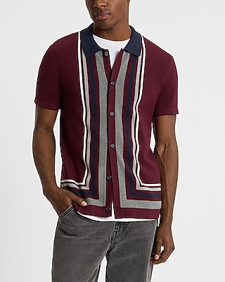 This short sleeve sweater polo is crafted from breathable cotton and features a point collar, a full button front, and striped framing.