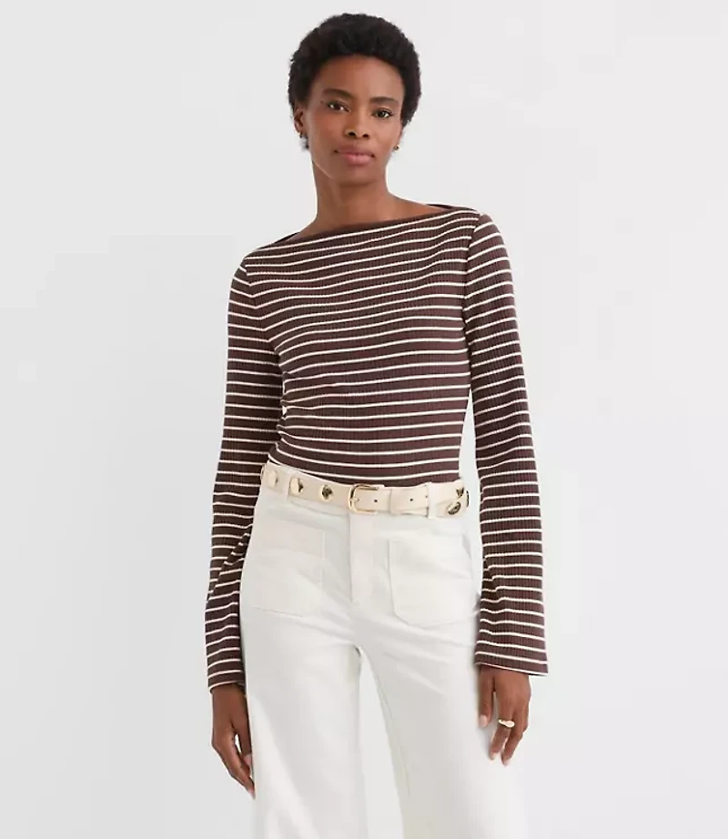 Stripe Ribbed Flare Sleeve Boatneck Top