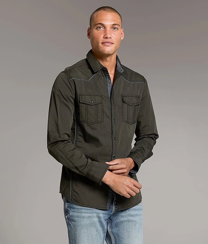 Woven pearl snap front shirt Athletic fit is larger in the shoulders, chest, waist and arm holes and is longer in the arms and body Contrast trim