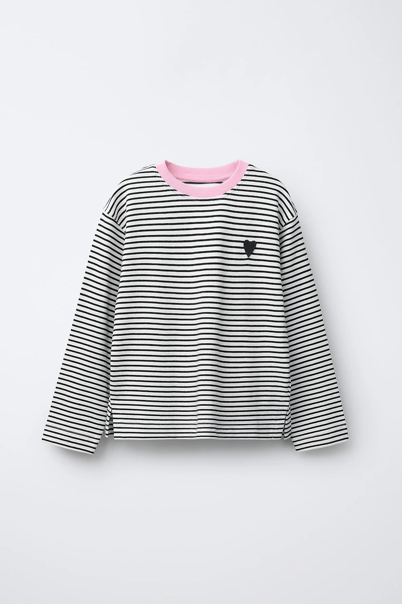 Round neck T-shirt with contrasting color and long sleeves. Striped print and embroidered heart detail at chest.