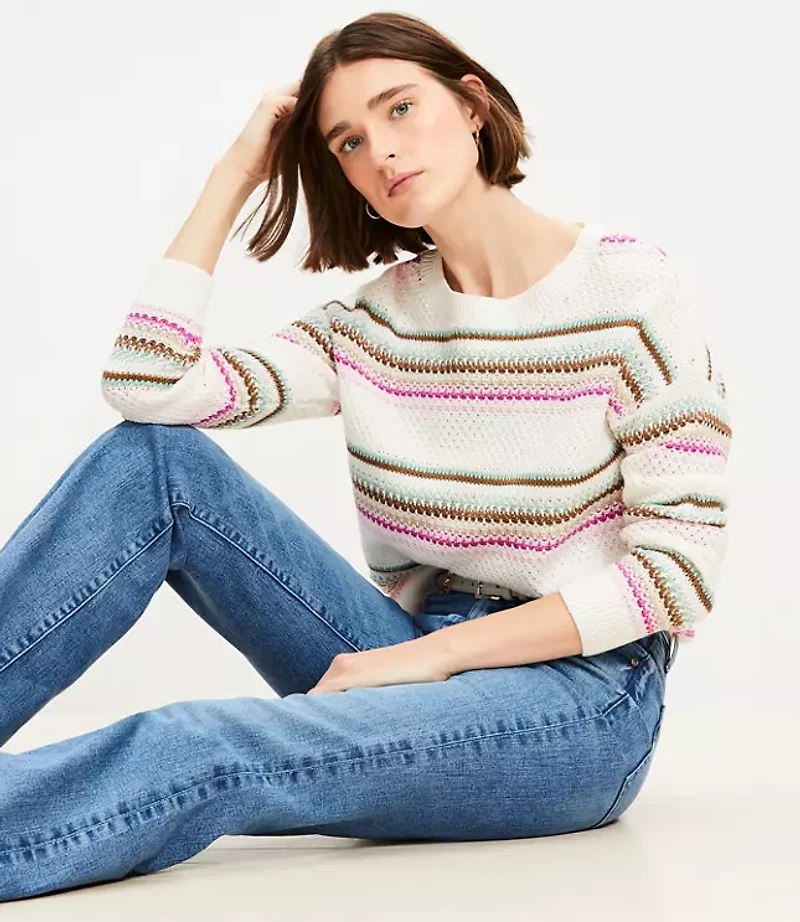 Adorned with vibrant and neutral stripes in a soft cotton knit, this texturally rich pointelle sweater is a chic and cheerful staple. Crew neck Long sleeves, Bullet1: 23"long, Imported:, Fit: Relaxed an easy shape that's just shy of loose, Length: Abbreviated - hits at natural waist, Fabrication: 100% Cotton, Garment Care: Machine Washable Loft Striped Pointelle Sweater Size XS Whisper White Women's by Loft Size Regular - XS Whisper White Women's 100%, Cotton Crew Neck Long Sleeve Pullover Sweaters Wear To Work 100% Cotton Machine Washable Best Fall Sweaters