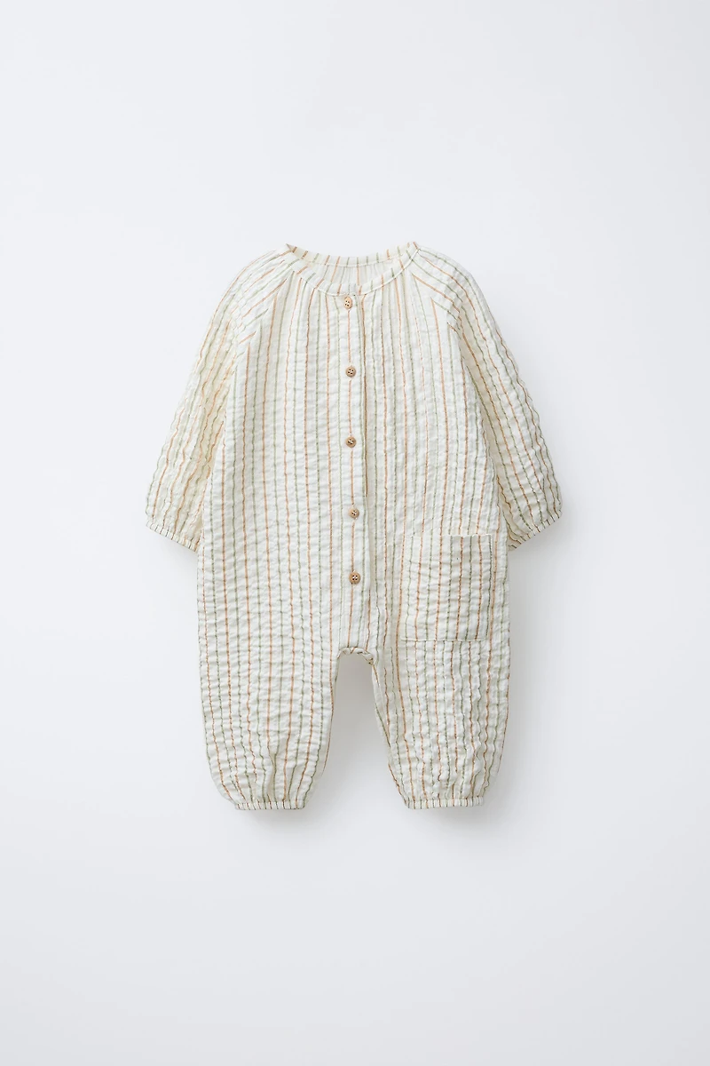 Round neck, long sleeve romper. Elasticized cuffs and hem. Front button closure. Patch pocket at front. Striped print.