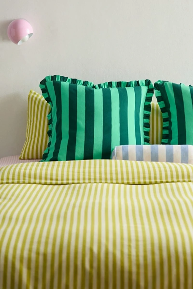 Elevate your bedding with this euro pillow sham in crisp cotton. Perfect for adding a pop of color to your space, this square sham feature allover stripes with ruffled trims. Available exclusively at Urban Outfitters.
