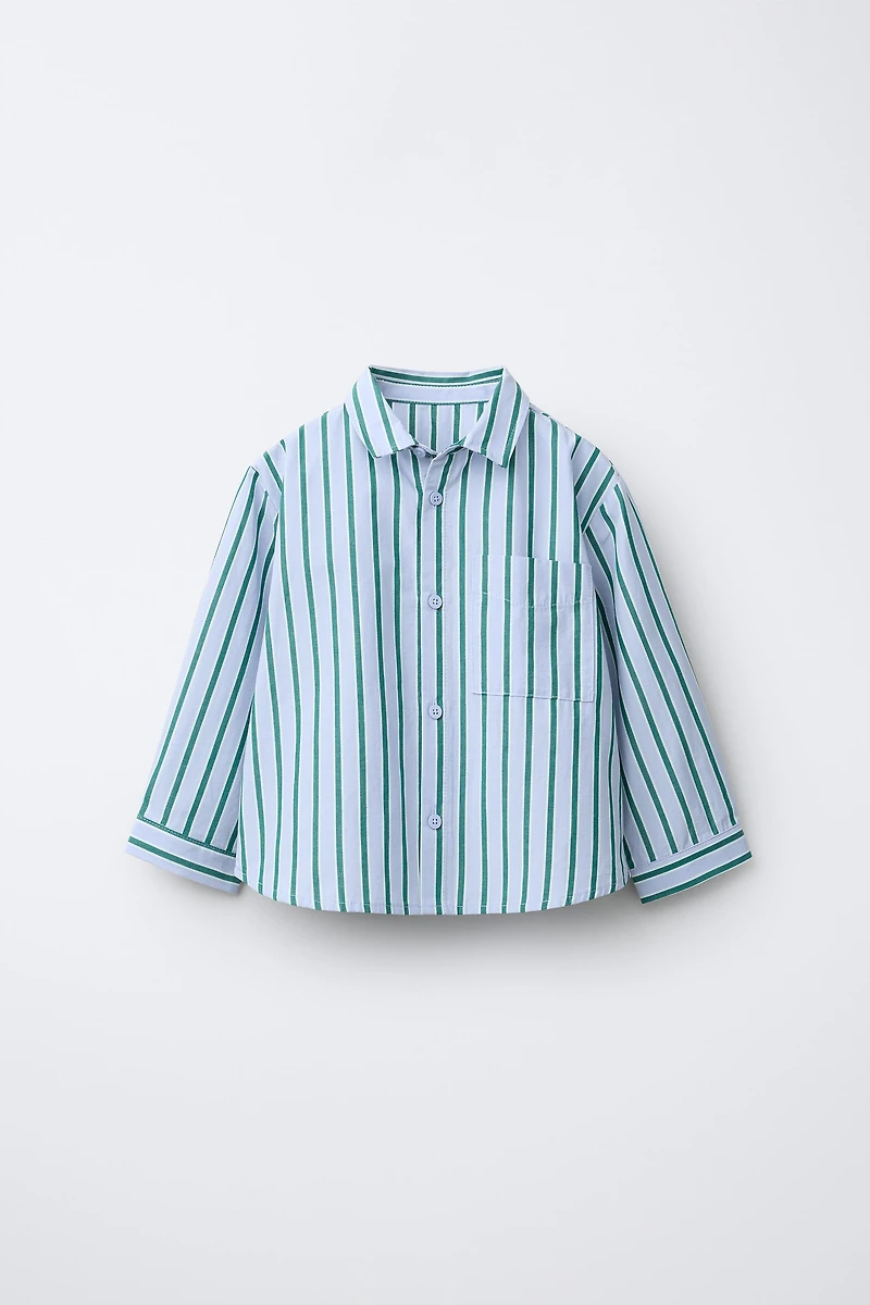 Shirt with shirt collar and long sleeves. Front button closure. Patch pocket at chest. Striped print.